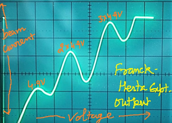 - Okay this question will clear the concept. You know the electrons emitted from the catode and reaches at the plate. If there is no loss of electrons energy in between these we will observe actual current accordingly. But if somehow electron loss the energy in in-elastic collison the energy get reduced and you will notice short fall in the beam current. Does the peak and valley in the above picture shows electrons reach at the plate without collision and losing energy after collision (an inelastic collision)?