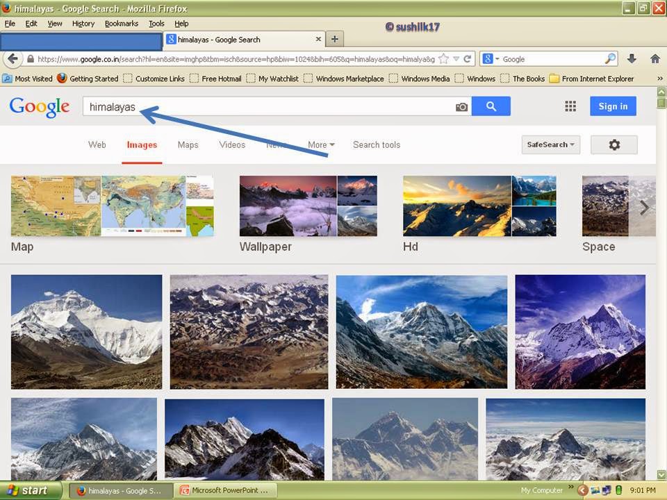 If you want to search images, first click the image button on the screen, as you click the button a new window opens for the search of images, like given below. Here in the search bar you just type the name for which you want to search the images, for an example I have to search images of the Himalyas, so I have typed it in the search bar as shown in picture-3.