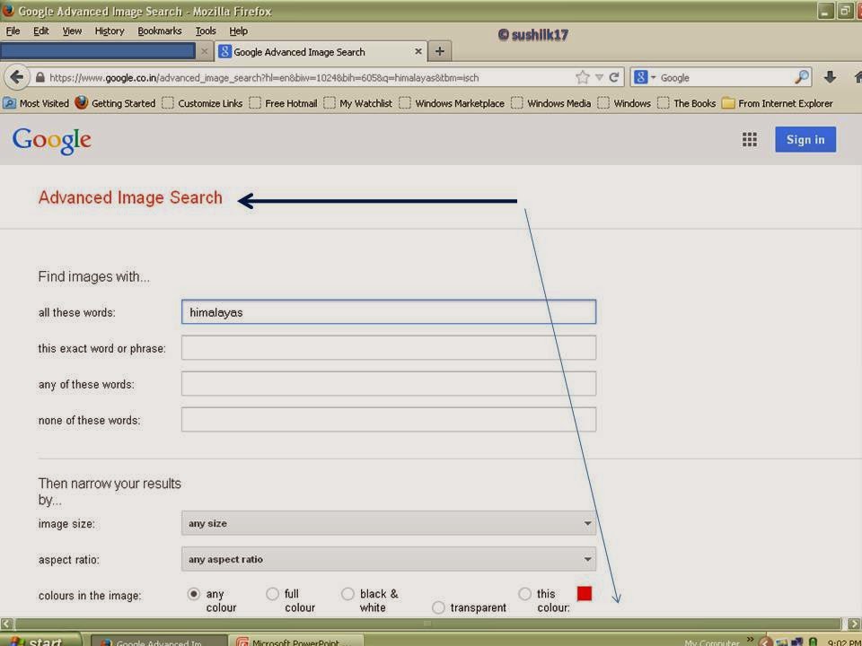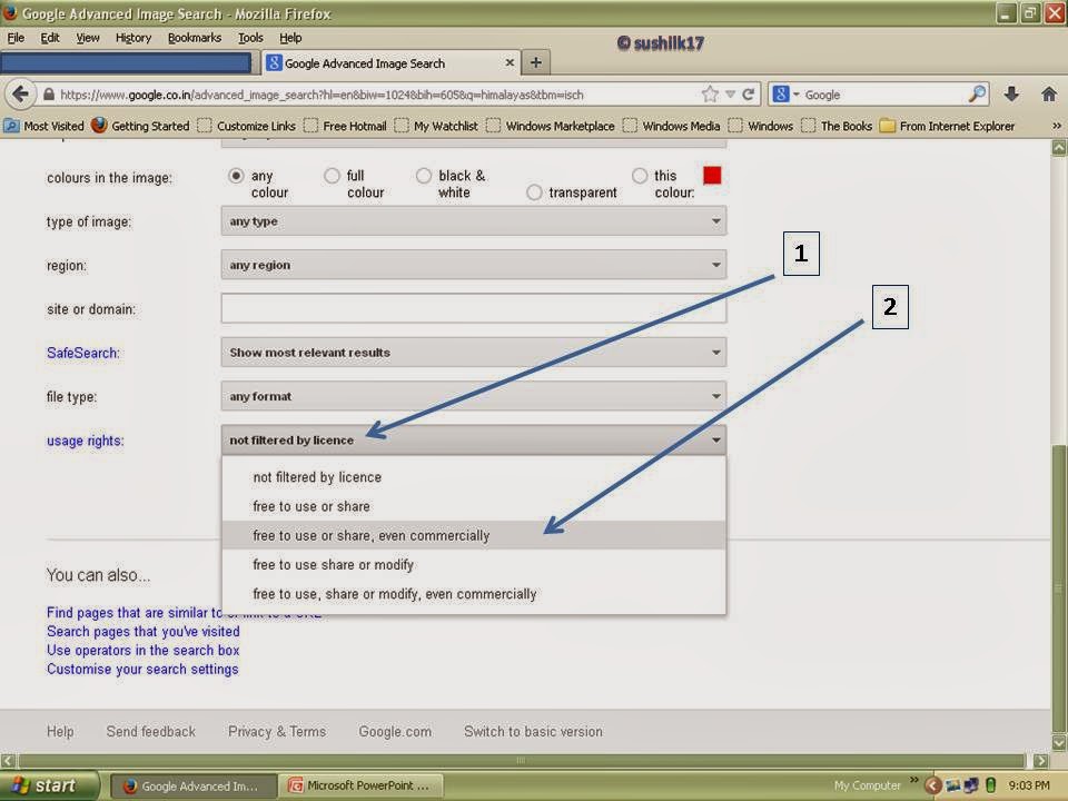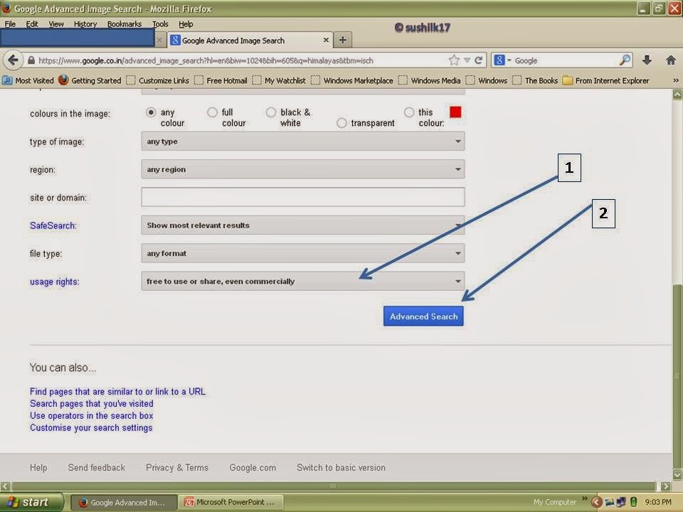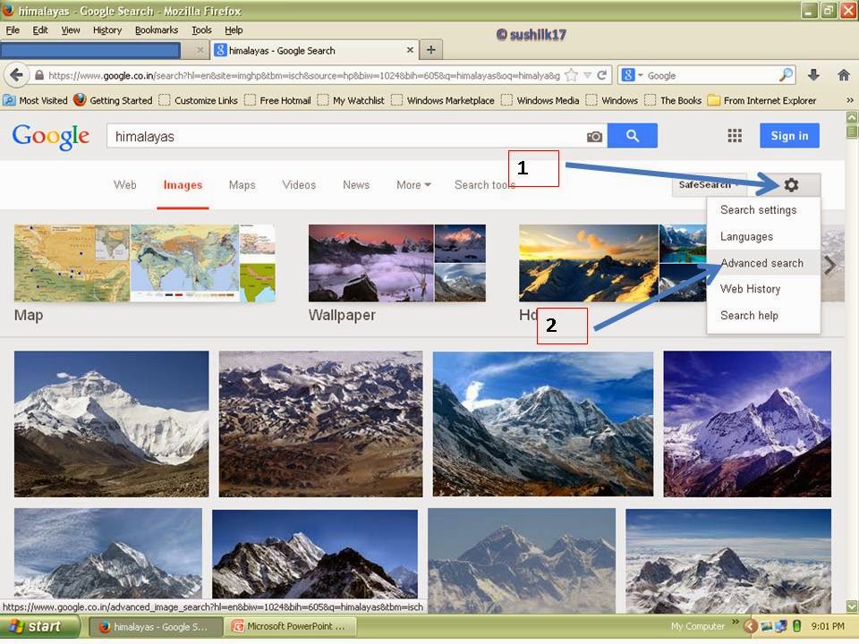 In picture 5, with the help of two arrows I have shown that what we have to do? first of all click the setting button i.e. number one, then scroll it and click on the advance search tab i.e. number two. When you will click the advance search tab, a new window will open with advance image search, like as here in picture-6.
