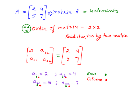 - A is of two by two order, having 4 elements, it means two rows and two columns. This is also called square matix.