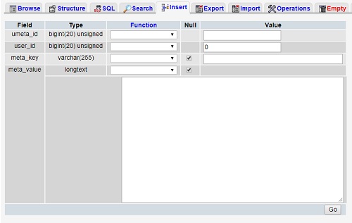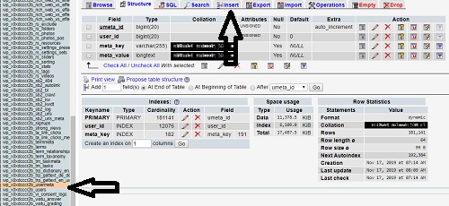 When you complete the fields then click OK button. Now again go to your_database and click the wp_metadata file. A new popup window will open as below in the picture. Arrow is marked on the concerned points for further action.